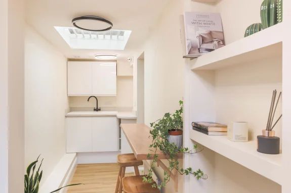 - A free to use kitchen equipped with microwave, coffee machine, fridge, sink, crockery and cutlery
